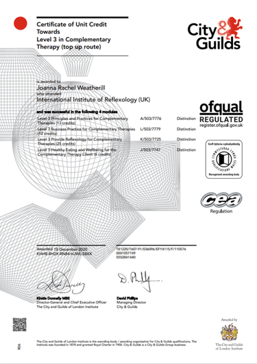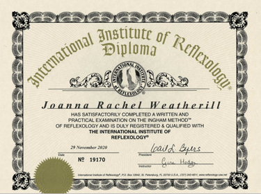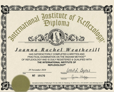 IIR(Dip)Level 3 Reflexology, December 2020 – I gained my diploma, passing modules with distinction, with the International Institute of Reflexology. The IIR is the only reflexology school licensed to teach the original Ingham Method of Reflexology. It is the combined work of the late Eunice Ingham and her nephew Dwight C Byers. The world’s leading authority on foot reflexology. The IIRUK has been training professional reflexologists for over 45 years in the UK.